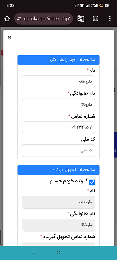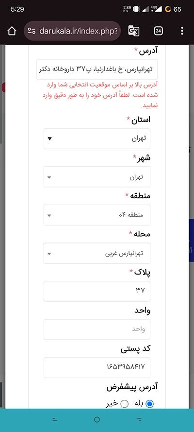 - در این مرحله، افرادی که قبلا حساب کاربری در داروکالا نداشتند، باید اطلاعات و آدرس خود را مانند نمونه وارد کنند.