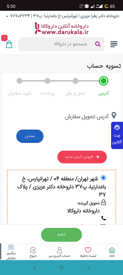 9. در صورتی که در داروکالا حساب کاربری دارید و اطلاعات و آدرس خود را قبلا ثبت کردید نیازی به وارد کردن اطلاعات نیست و بر روی گزینه ادامه کلیک کنید.